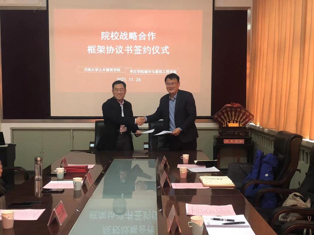 11月26日,枣庄学院党委委员、统战部部长、kaiyun体育网页登录入口院长林勇一行4人赴济南大学土木建筑学院考察学习并签订院校战略合作框架协议。副院长裘娜、院长助理孙启林、给排水专业负责人王昌稳参加了本次签约活动。