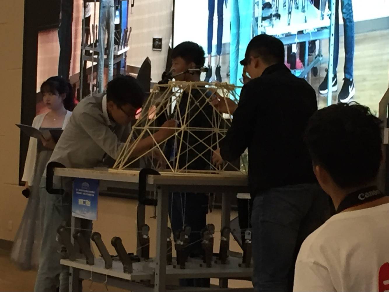 本次大赛,有来自山东大学、哈尔滨工业大学(威海分校)、中国石油大学、青岛理工大学等28所省内高校的31只队伍参加。kaiyun体育官网由赵澄、张耀、贾传奇三名同学组成的队伍在袁下下、李晓明老师指导下参加了比赛。竞赛以“承受多荷载工况的大跨度空间结构建模设计与制作”为赛题,模型采用竹质材料制作,并在加载现场施加一级、二级竖向荷载和三级水平荷载来考验结构模型的挠度和承载能力。评委对各参赛队在设计计算、结构选型与制作质量、现场表现、模型承载力、模型刚度五个环节中的表现分别评分,最后由组委会来综合评定各队总得分。kaiyun体育官网作品“简约”成功通过了一级竖向荷载40KG、二级最大竖向荷载24KG和三级最大水平荷载8KG后完好无损。据统计,其中31个比赛作品中有1/3的作品在没达到要求承载荷载前模型已破坏。