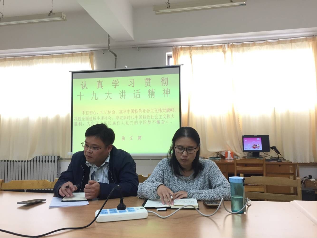 10月25日主题党日,由教工党支部曲文婷同志主持,学习了党的十九大精神,李天鹏、徐鸿飞两位同志做了交流发言。