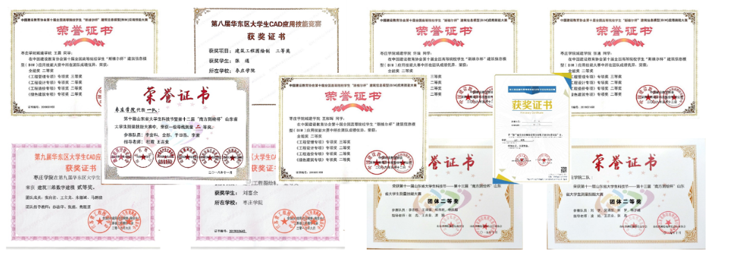 多年的科研积累,已经形成产学研协同发展局面,多种形式开展丰富多彩的第二课堂活动,学生可以充分的锻炼自己分析解决复杂工程问题的能力和动手能力。学生深度参与教师科研,2019年以来,学生做为项目负责人申请立项国家级创新创业科研项目近30项,省级10项,在校生发表科研论文、申请专利已是常态,这些成果为学生在考研和就业中增加了厚重的资本。大学生竞赛方面:获山东省结构设计大赛一等奖1项,二等奖4项,三等奖1项;全国高等院校学生“斯维尔杯”建筑信息模型(BIM)应用技能大赛获国家级奖励33人次;华东区大学生CAD应用技能竞赛获团体二等奖17项,个人一等奖11项,二等奖7项,三等奖14项;全国BIM大赛一等奖2项;山东省大学生力学竞赛荣获本科组二等奖1项、三等奖1项,专科组三等奖1项。